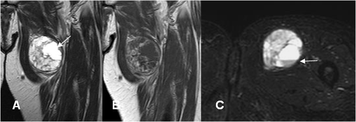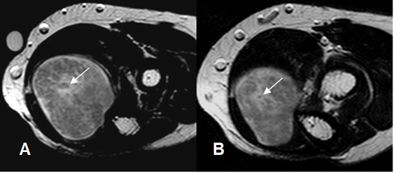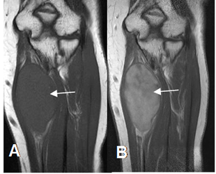 A: RM coronal en T2 y B: RM coronal en T1 con contraste. Lesión redondeada y de bordes bien definidos, sobre los músculos aductores. Tiene consistencia mixta con áreas quísticas y realce del contraste en las zonas sólidas.