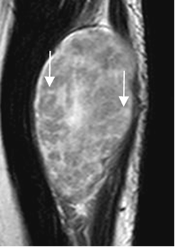 Es clásico el signo de target en los tumores neurogénicos, mas frecuente en el neurofibroma. Se describe como zona hipointensa en T2, dentro de una lesión hiperintensa, que corresponde a un foco de fibrosis central. (44). (Fig 177).