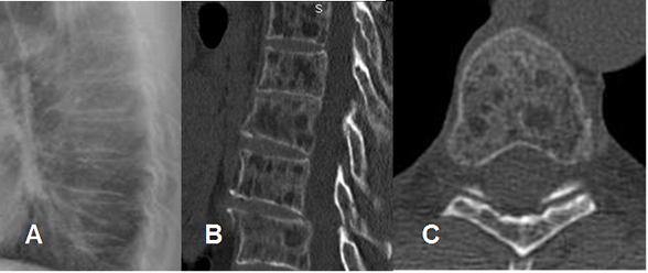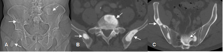 A: Rx AP, B y C: TAC axial. Múltiples lesiones densas en los huesos iliacos, columna y fémur derecho, por metástasis blásticas de neoplasia pulmonar.