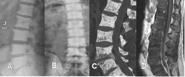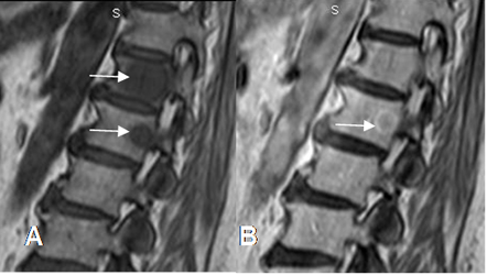 A: RM sagital en T1. Lesiones hipointensas en D12 y L1, por enfermedad metastásica de próstata.