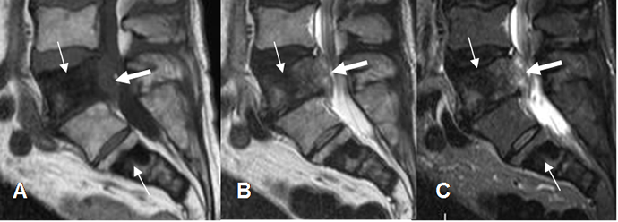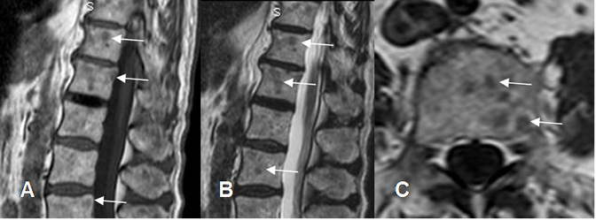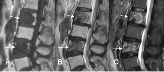 A: RM sagital en T1, B: RM sagital en T2 y C: RM sagital en STIR. Igual paciente anterior. Alteración en la señal de L2 y L4, hipointensas en T1 y T2 e hiperintensas en STIR, por metástasis mixtas de neoplasia de mama.