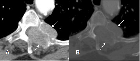 A: TAC axial en ventana de tejido y B: TAC axial en ventana osea. Lesión lítica que compromete los elementos posteriores en el lado izquierdo, por metástasis de neoplasia renal. Hay masa de tejidos blandos, que se extiende hacia el canal medular.