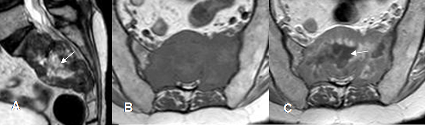 A: RM sagital en T2. Lesión neoplásica que compromete el sacro, de señal heterogénea con predominio hipointenso y centro hiperintenso. (Flecha).