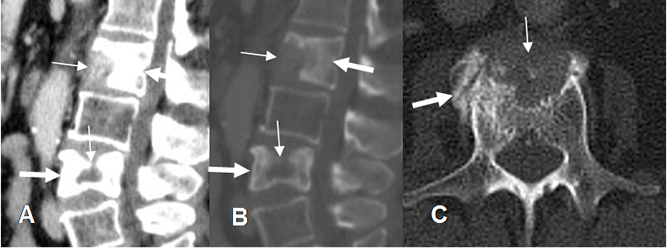 A: TAC reconstrucción sagital en ventana de tejido, B: TAC reconstrucción sagital en ventana ósea y C: TAC axial Múltiples lesiones líticas (Flechas delgadas) y blásticas (Flechas gruesas), por neoplasia de mama.