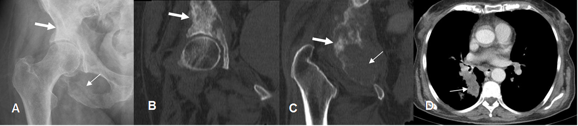 A: Rx AP, B y C: TAC reconstrucción coronal y D: TAC axial de tórax. Lesiones líticas en el ramo isquiopúbico (Flechas delgadas) y blásticas en el acetábulo (Flechas gruesas), que rodean la cadera, correspondiendo a enfermedad metastásica de pulmón.