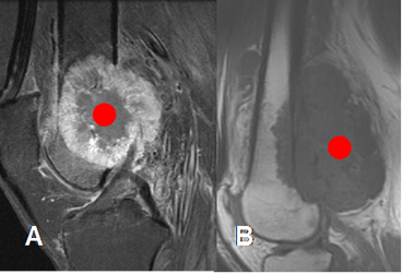 A y B: RM sagital. Masas de tejidos blandos en el fémur distal. En A el centro geométrico se localiza en el hueso, indicando origen óseo y en B, el centro esta por fuera del hueso, lo que sugiere origen en los tejidos blandos.